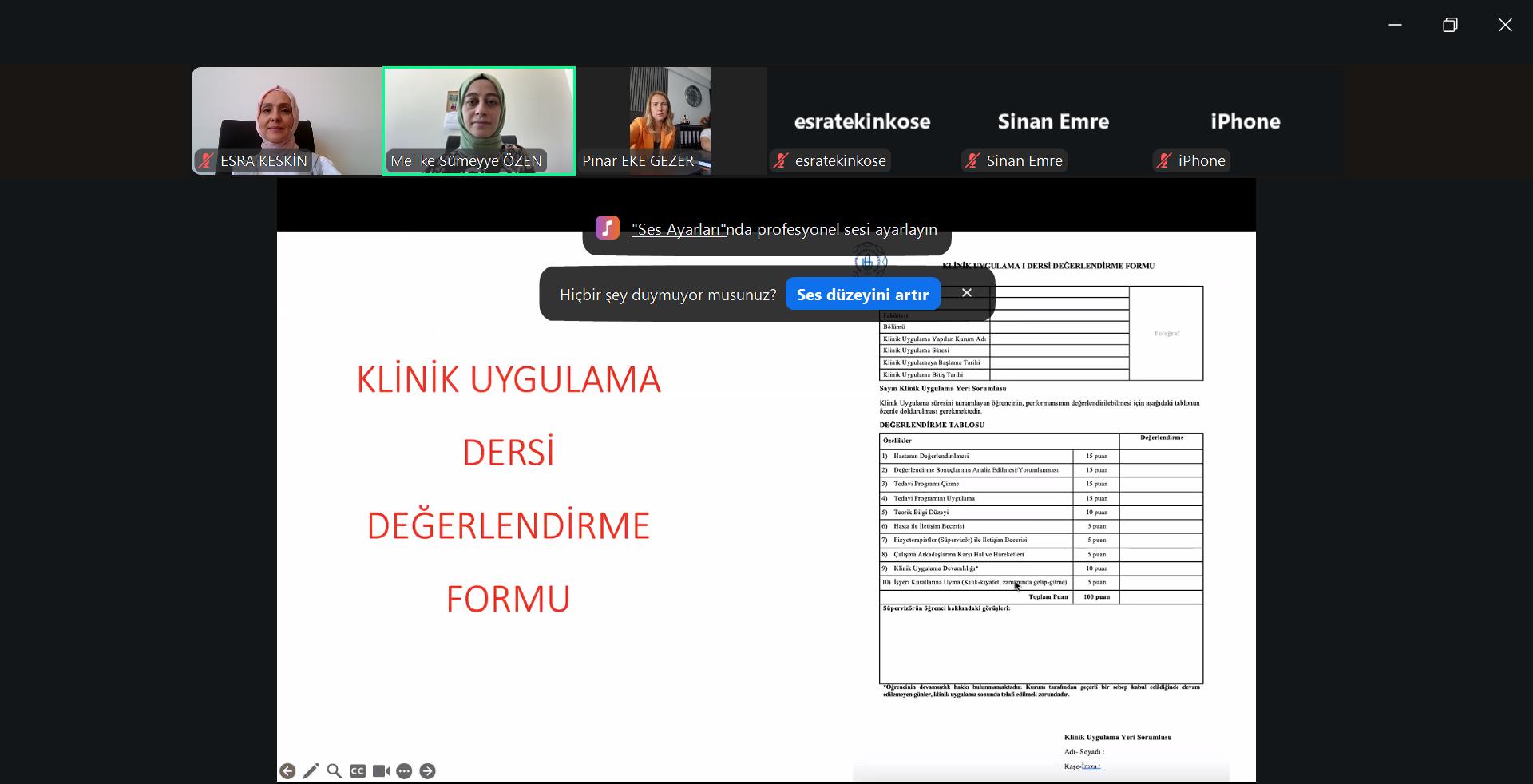 An online information meeting was held with the institutions and supervisors working in the institutions where our students will practice on September 19, 2025, within the scope of the Clinical Practice-I course in the Fall Semester of the 2025-2026 Academic Year. The meeting, organized under the leadership of our department's Clinical Practice Course Committee members Dear Assist. Prof. Dr. Melike Sümeyye ÖZEN and Dear Assist. Prof. Dr. Esra KESKİN, was attended by faculty members from our department, owners of institutions where our students will practice, and physiotherapists. At the information meeting, institutions were informed about the dates on which our students will practice in the fall semester, rotation groups, forms and documents that students must prepare, schedules that supervisors must follow, and exams. After gathering feedback from participants on past semesters, we listened to their expectations for this upcoming semester. The meeting concluded with the hope of a productive clinical practice semester. We thank everyone who participated.