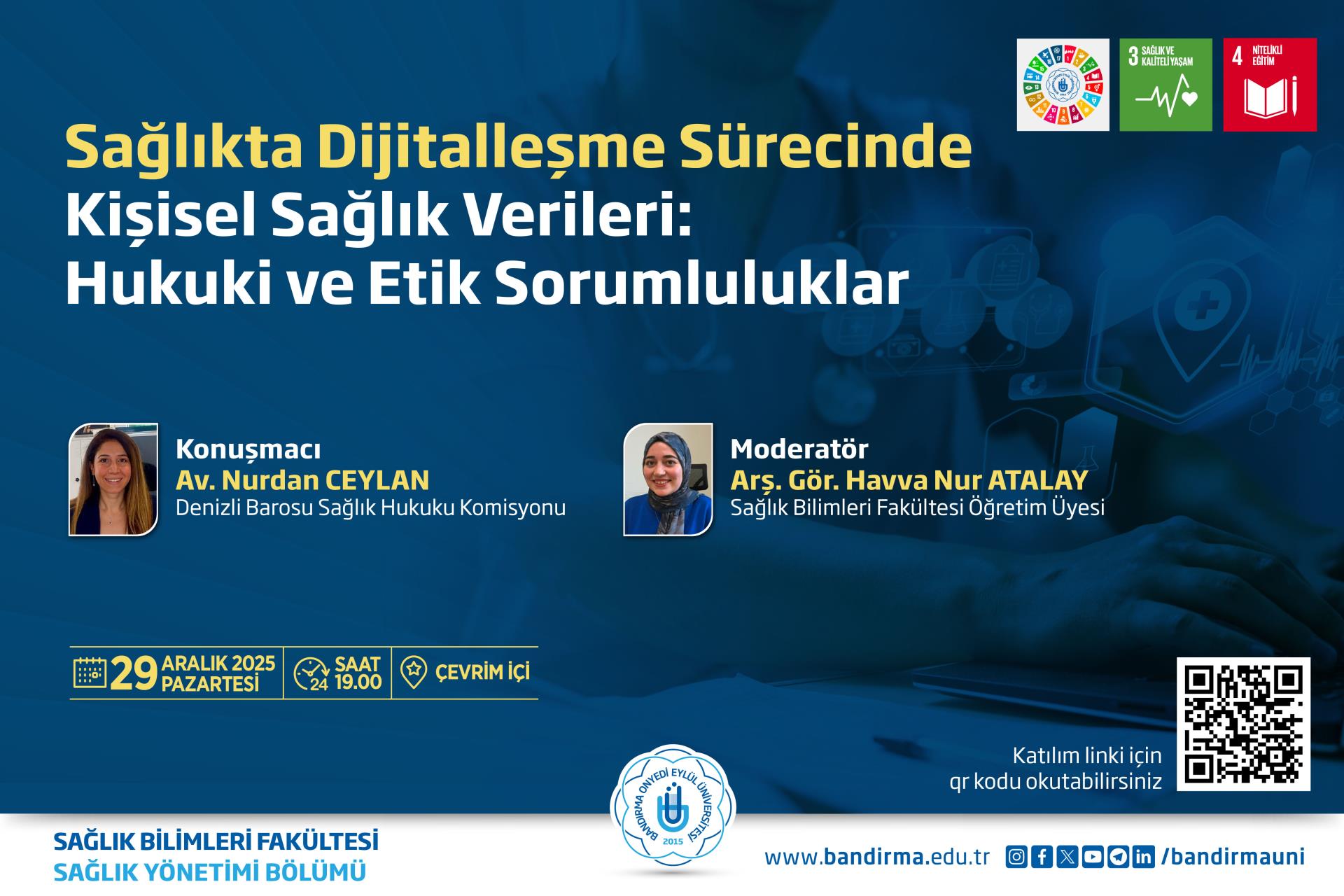 Our department is organizing an online event that will address the legal and ethical responsibilities regarding the protection of personal health data in the digitalization process of healthcare. The event, moderated by our department's research assistant Havva Nur ATALAY, will feature Attorney Nurdan Ceylan, a member of the Denizli Bar Association's Health Law Commission, as a speaker. The event will evaluate current legal regulations concerning the protection of personal health data and the ethical dimensions of digital health applications.