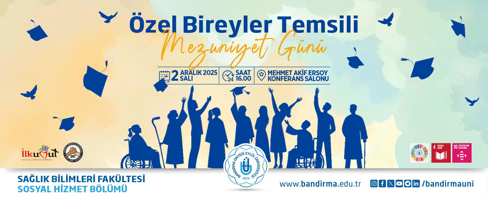 Our Social Work Department and the Social Work Community are organizing a Graduation Day for Individuals with Disabilities as part of the "Social Work Practices for the Community" course, led by Assoc. Prof. Dr. Adem Bölükbaşı, as part of the International Day of Persons with Disabilities celebrations on December 3rd. The event aims to highlight the hard work of students at Bandırma First Hope Special Education and Rehabilitation Center, to share in this pride with their families, and to raise awareness of inclusiveness within our community.