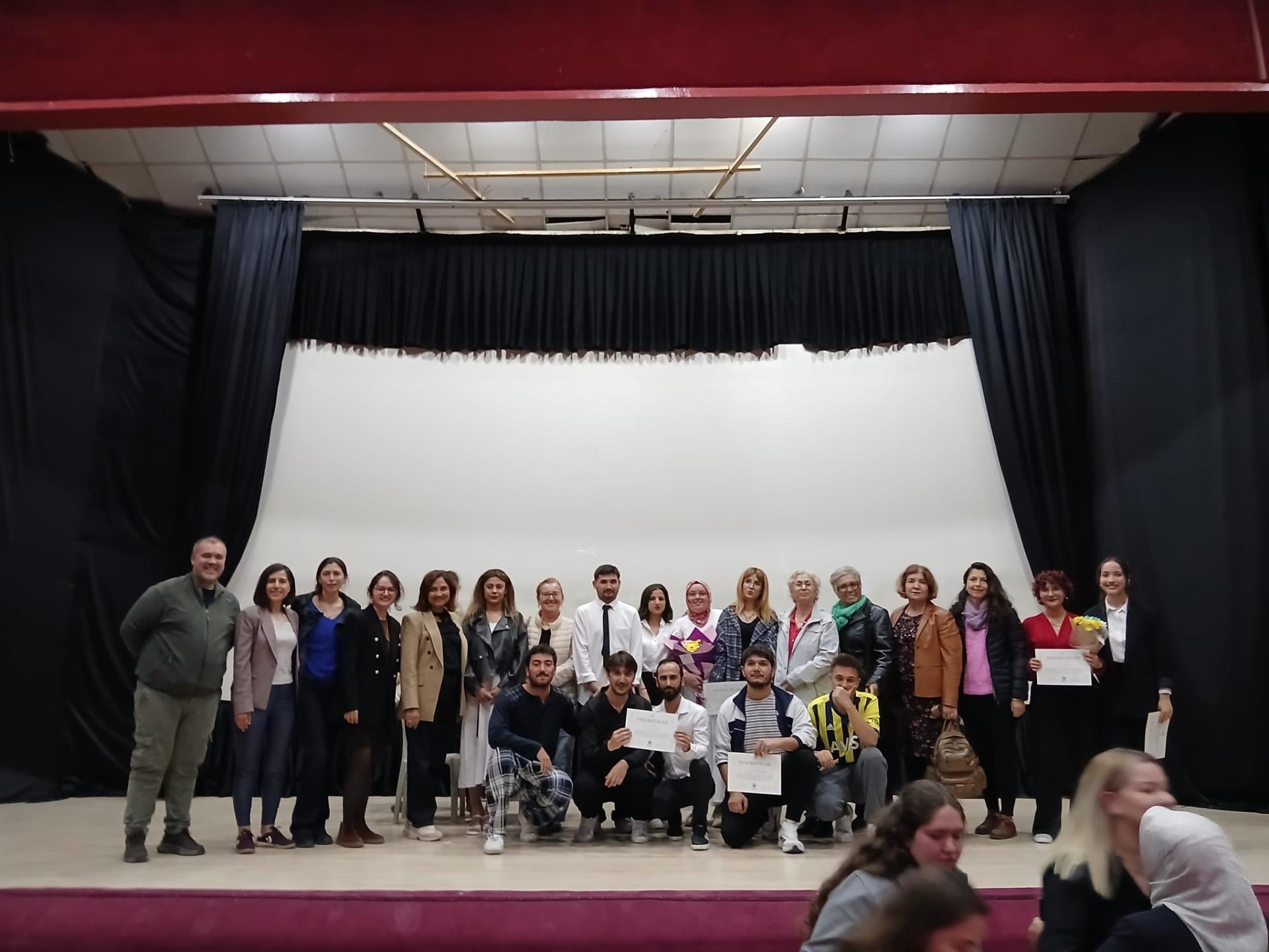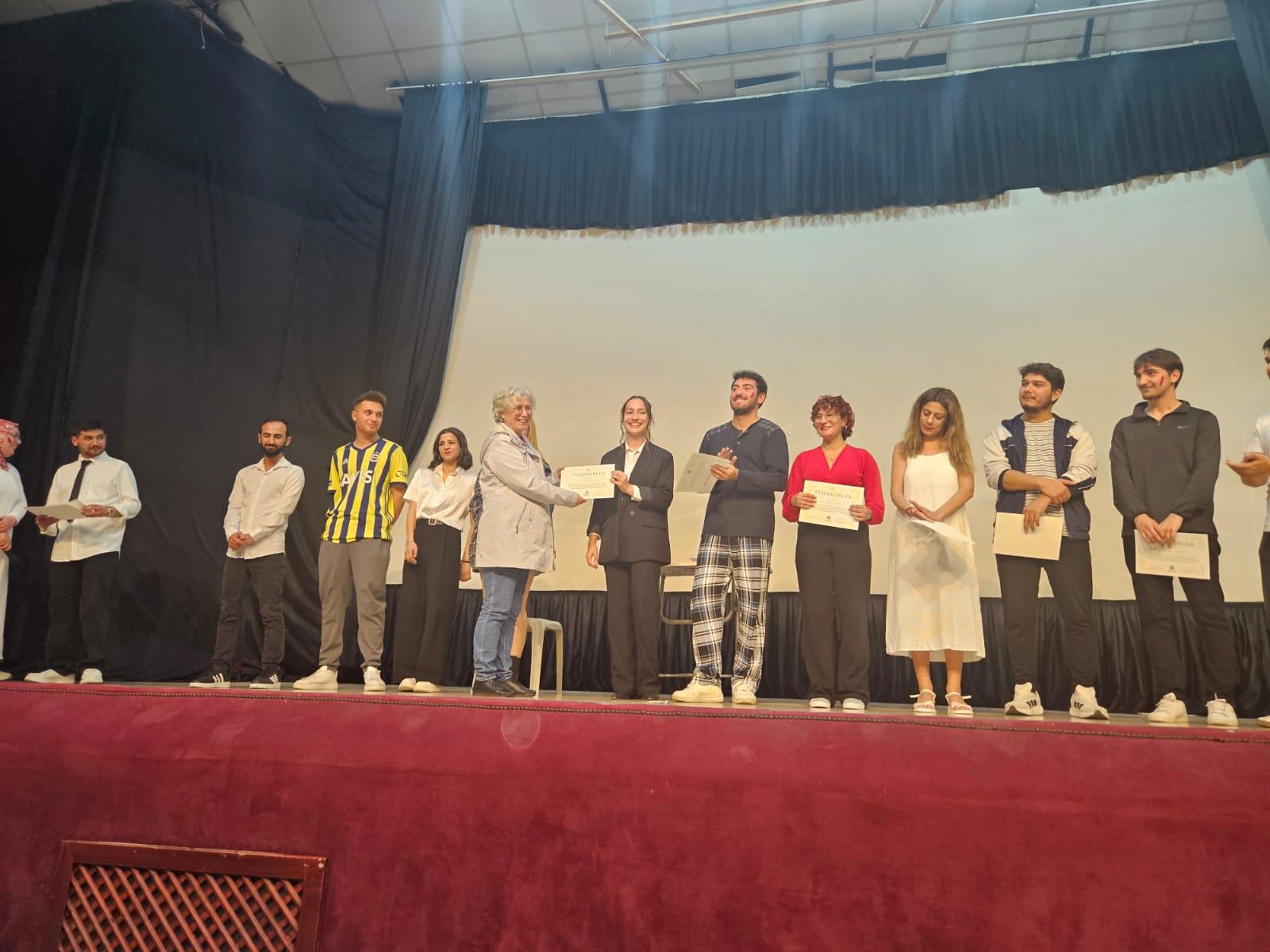 Following the performance, certificates of appreciation were presented to the Üçüncü Yeniciler Theater Team by Assoc. Prof. Dr. Zeynep Aca, Assistant Professor Gizem Burcu Karaali, Prof. Dr. Serap Palaz Çakır (Dean of the Faculty of Economics and Administrative Sciences), Nilgün Germiyan (President of the Women's Solidarity Association), and Nail Yurdusev (President of the İzge Disabled Association).