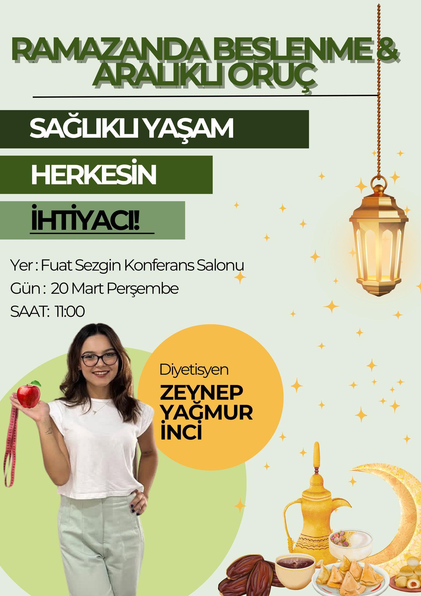 Beslenme ve Diyetetik Öğrenci Topluluğu tarafından 'Ramazanda Beslenme ve Aralıklı Oruç' konusunda, 20 Mart 2025 Perşembe günü Saat:11.00'da Fuat Sezgin Konferans Salonunda seminer gerçekleştirilmiştir. Konuşmacı olarak Sayın Dyt. Zeynep Yapmur İNCİ katılmıştır.