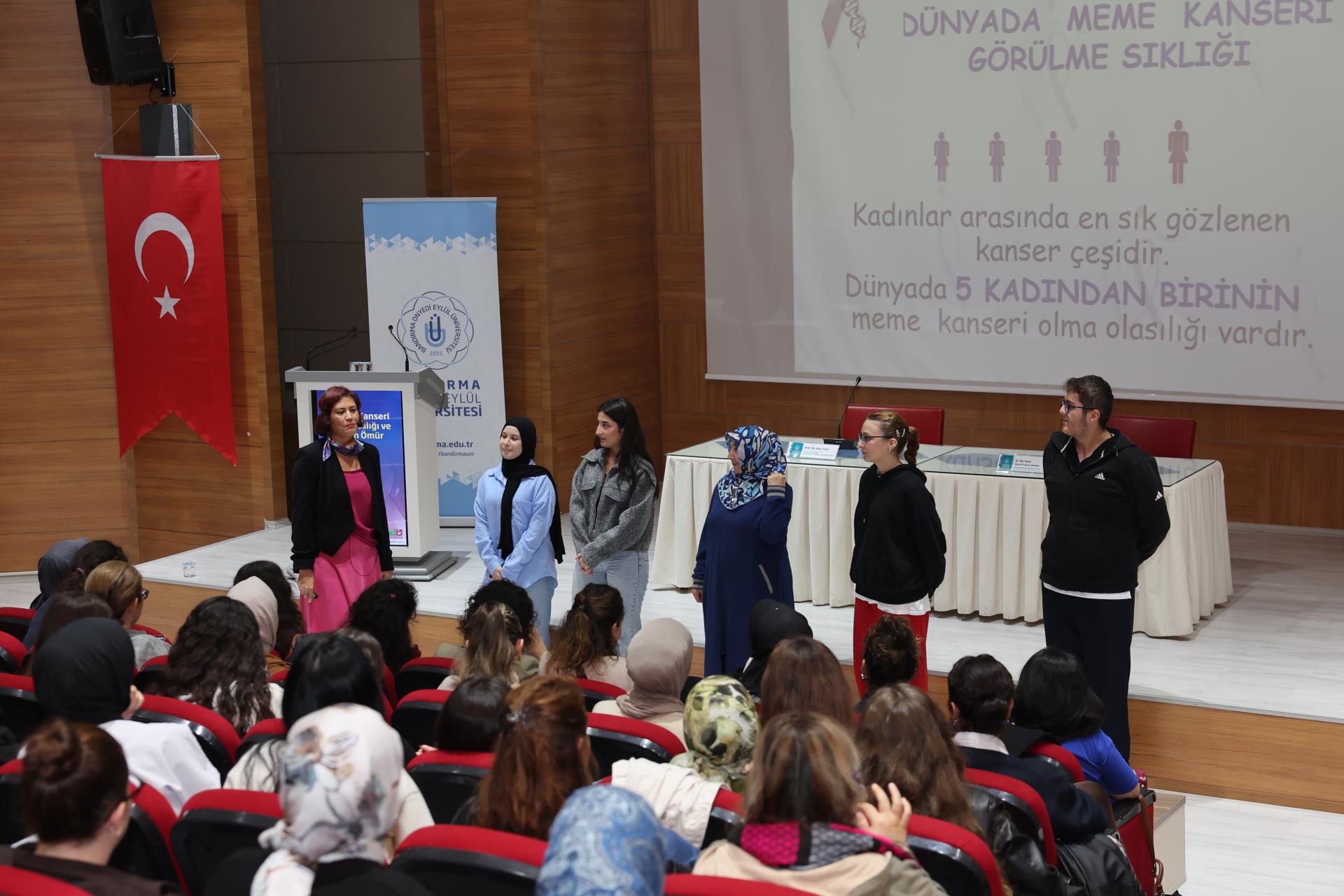 Konferansın konuşmacısı Balıkesir Üniversitesi Sağlık Bilimleri Fakültesi Hemşirelik Bölümü öğretim üyesi Prof. Dr. Arzu Tuna, 1–31 Ekim Meme Kanseri Farkındalık Ayı dolayısıyla gerçekleştirdiği sunumunda meme kanseri tanılama yöntemleri, tarama periyotları, risk faktörleri, belirtiler ve koruyucu önlemler hakkında kapsamlı bilgiler paylaştı. Tuna, öğrencilerle etkileşimli bir sunum gerçekleştirerek farkındalığın yalnızca kadınlar için değil, toplumun tüm bireyleri için taşıdığı önemi vurguladı.