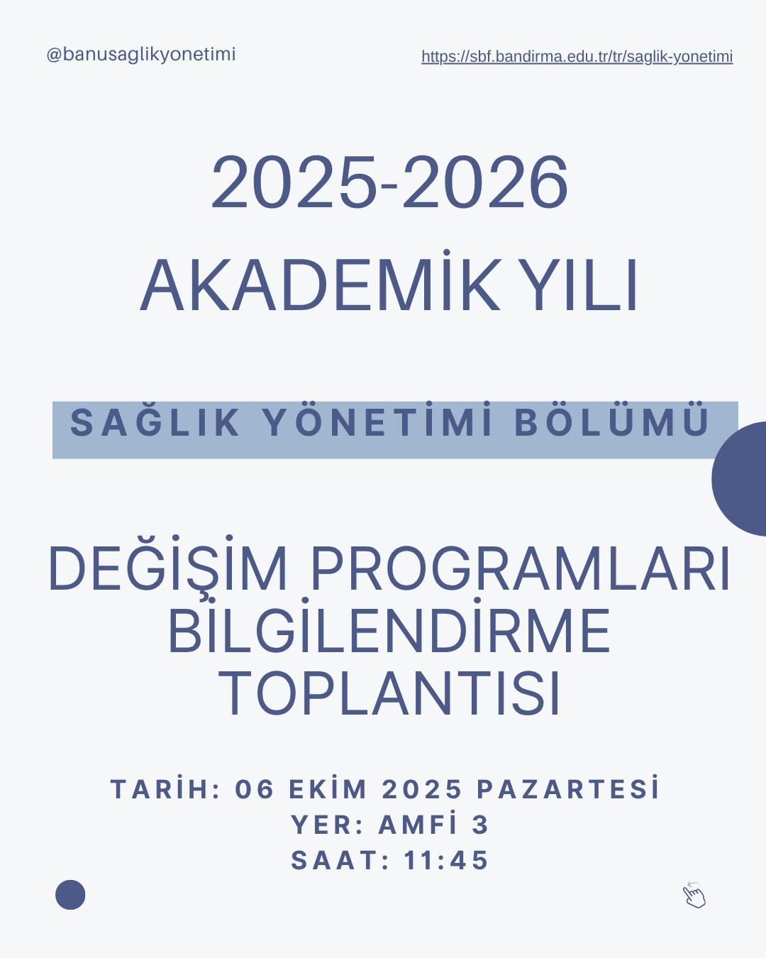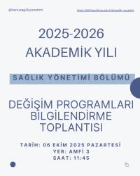 06 Ekim 2025 Pazartesi günü Amfi 3'te saat 11.45'te Bölümümüz Değişim Programları Koordinatörü Doç. Dr. Ekrem SEVİM tarafından Değişim Programları (Erasmus+, Farabi, Mevlana) Bilgilendirme Toplantısı gerçekleştirilecektir.