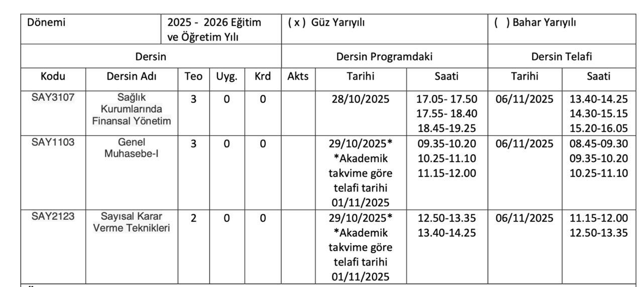 Dr. Öğr. Üyesi İnci Merve ALTAN'ın, 28-29 Ekim 2024 tarihlerinde yapılamayan derslerinin telafileri, aşağıda belirtilen gün, saat ve dersliklerde gerçekleştirilecektir.
