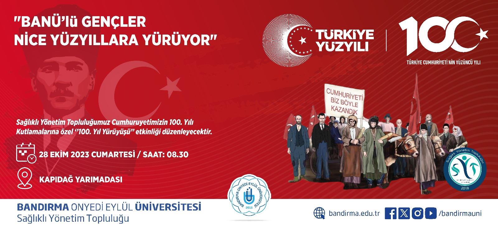 Cumhuriyetimizin 100. yılını kutlamak amacıyla Sağlıklı Yönetim Topluluğu tarafından "100.Yıl Yürüyüş Etkinliği" düzenlendi. Bu kapsamda Kyzikos Antik Kenti, Yukari Yapıca Höleti, Langada Şelalesi, Kirazlı Şelalesi ve Kirazlı Manastırı rotasında BANDAK'tan profesyonel katılımcılarla birlikte doğa yürüyüşü yapıldı. Sağlıklı Yönetim Topluluk üyeleri ve sağlık yönetim bölümü öğrencileri bayraklarla yürüyüş yaptı ve İstiklal Marşımız okundu. Cumhuriyetimizin 100.yılı coşkuyla kutlandı.
