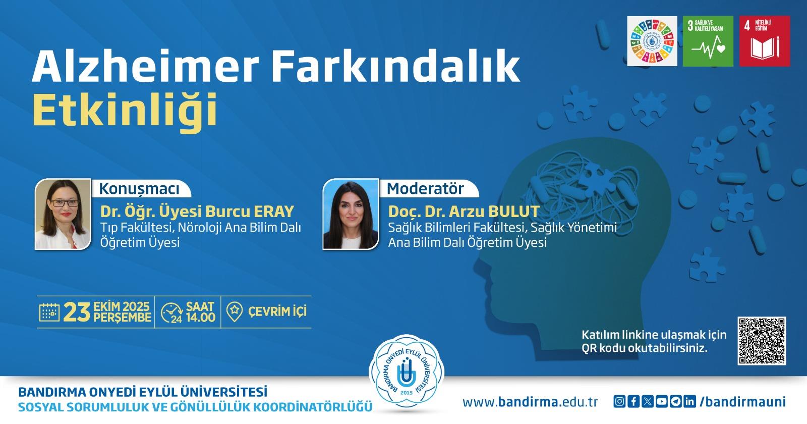 Üniversitemizde Alzheimer hastalığına ilişkin toplumsal bilinç oluşturmak amacıyla çevrim içi bir etkinlik gerçekleştirilmiştir. Sosyal Sorumluluk ve Gönüllülük Koordinatörlüğü tarafından organize edilen etkinlikte, hastalığın tanınması ve erken teşhisin önemi üzerinde durulmuştur.