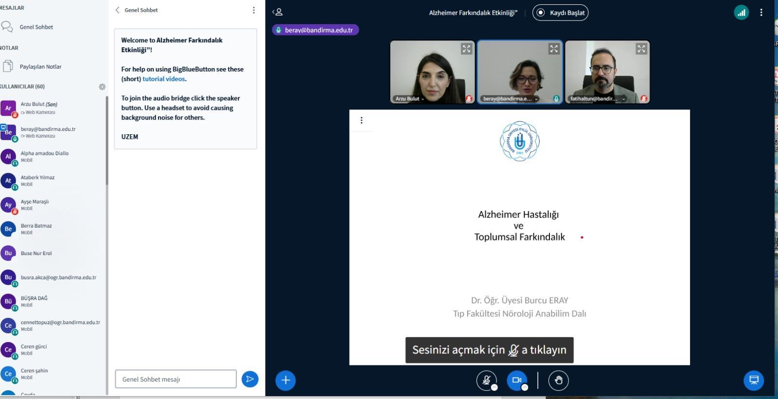 Etkinlikte BANÜ Tıp Fakültesi Nöroloji Anabilim Dalı’ndan Dr. Öğr. Üyesi Burcu Eray, Alzheimer hastalığının belirtileri, risk faktörleri ve erken tanı süreçleri hakkında kapsamlı bilgiler sunmuştur. Oturumun moderatörlüğünü ise Bölümümüz öğretim üyesi Doç. Dr. Arzu Bulut yürütmüştür.