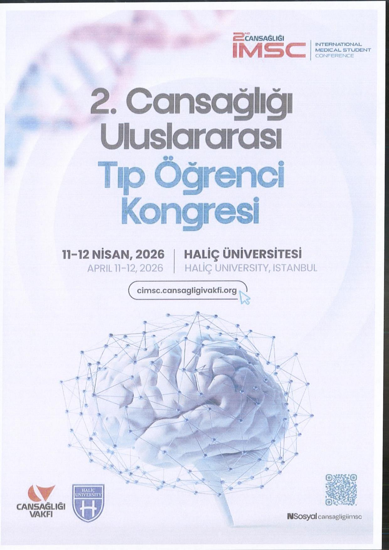 Cansağlığı Vakfı tarafından düzenlenen 2. Cansağlığı Uluslararası Tıp Öğrenci Kongresi, 11–12 Nisan 2026 tarihlerinde Haliç Üniversitesi’nde gerçekleştirilecektir. Kongreye katılım ve başvuru koşullarına ilişkin detaylı bilgiye aşağıdaki bağlantı üzerinden ulaşılabilmektedir.