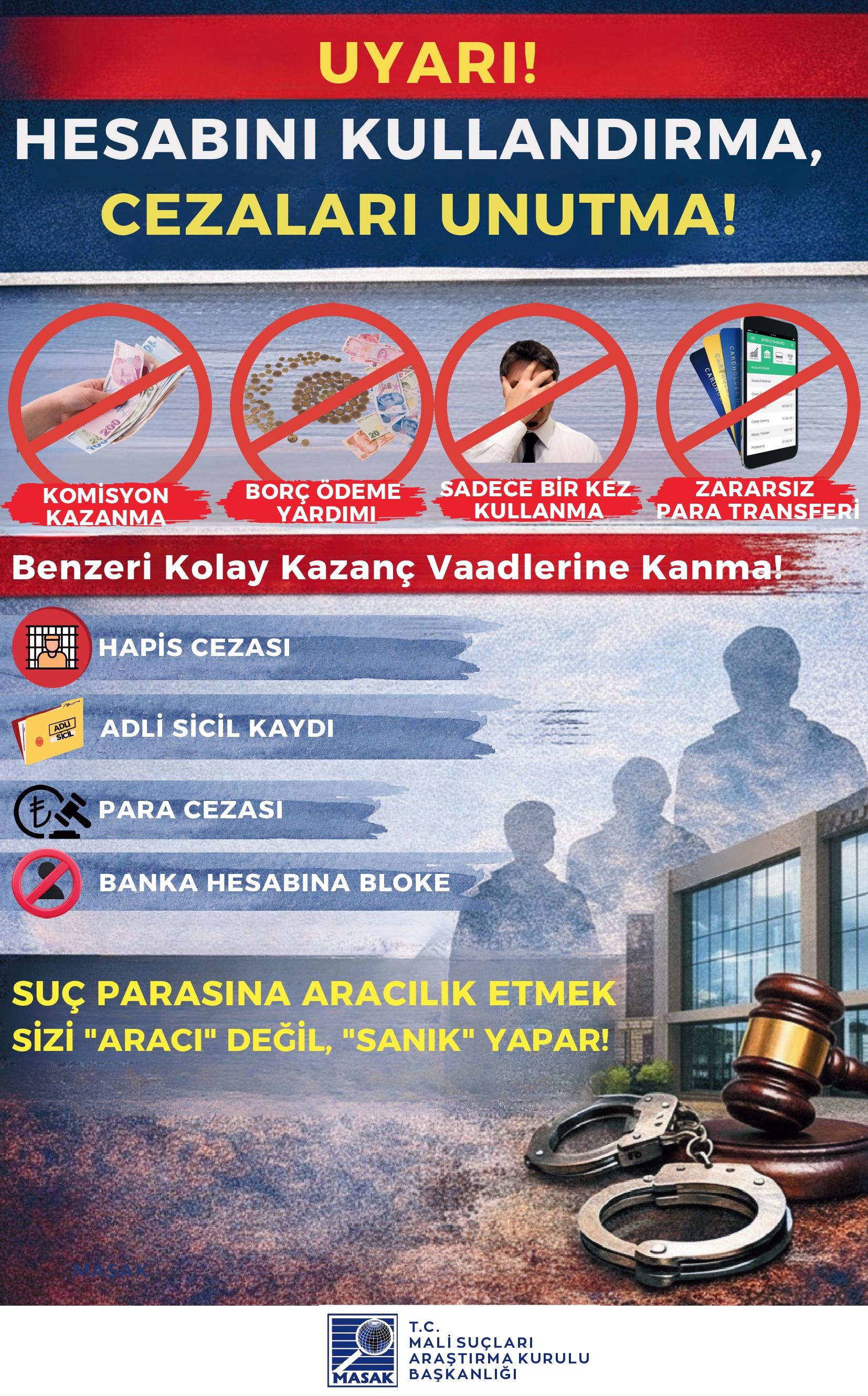 Hazine ve Maliye Bakanlığı ile İçişleri Bakanlığı tarafından iletilen yazılar kapsamında; banka hesapları, IBAN numaraları ve dijital cüzdanların üçüncü kişiler tarafından kullanılmasına ilişkin riskler konusunda öğrencilerimizin dikkatli olmaları gerekmektedir.
