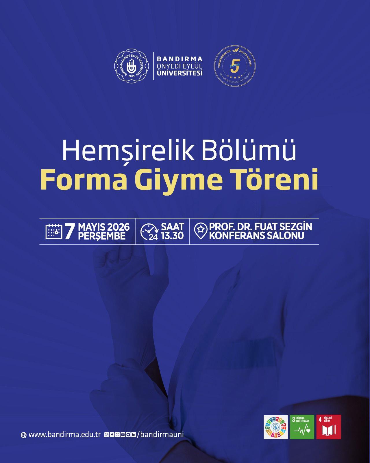 Bandırma Onyedi Eylül Üniversitesi Sağlık Bilimleri Fakültesi Hemşirelik Bölümü tarafından “Forma Giyme Töreni” düzenlenecektir.