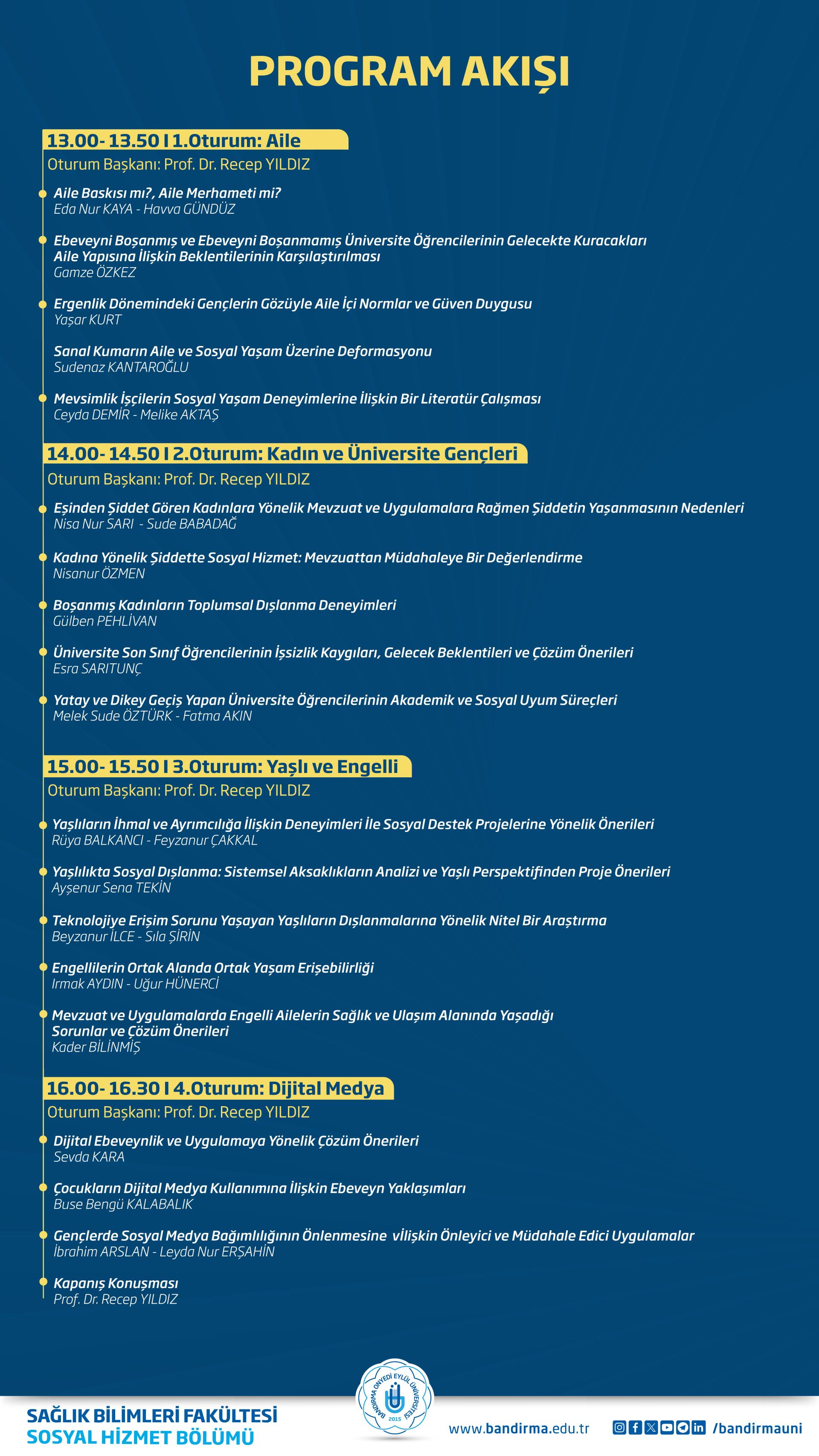 Sempozyumda; aile, kadın, çocuk, gençlik, yaşlılık, engellilik, dijitalleşme ve sosyal dışlanma gibi sosyal hizmet alanının güncel ve çok boyutlu konuları, öğrenciler tarafından yapılacak sunumlarla ele alınacaktır. Program kapsamında dört oturumda gerçekleştirilecek sunumların oturum başkanlığını Sosyal Hizmet Bölümü Öğretim Üyesi Prof. Dr. Recep Yıldız üstlenecektir.