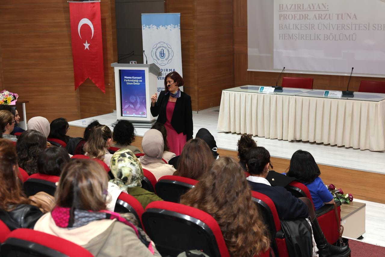 Balıkesir Üniversitesi Sağlık Bilimleri Fakültesi Hemşirelik Bölümü Öğretim Üyesi Prof. Dr. Arzu Tuna’nın konuşmacı olarak yer aldığı konferansta, meme kanserinin tanılama yöntemleri, tarama periyotları, risk faktörleri, belirtileri ve koruyucu önlemleri hakkında katılımcılara kapsamlı bilgiler sunuldu. Prof. Dr. Tuna, gerçekleştirdiği etkileşimli sunumda, meme kanseri farkındalığının sadece kadınlar için değil, tüm toplum bireyleri için hayati önem taşıdığını vurguladı. Program sonunda Hemşirelik Bölüm Başkanı Prof. Dr. Latife Utaş Akhan tarafından Prof. Dr. Arzu Tuna’ya katkılarından dolayı teşekkür belgesi takdim edildi.