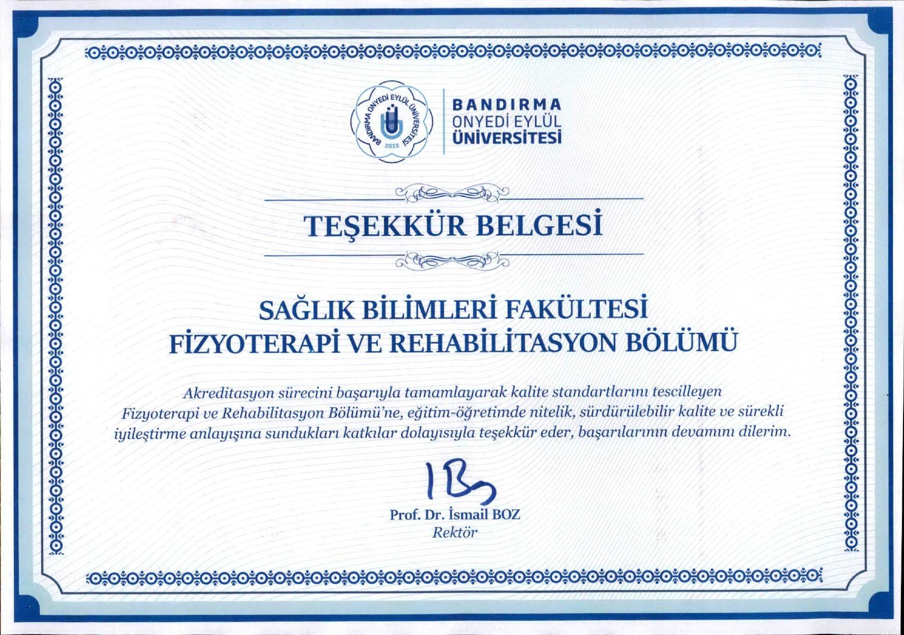 Fizyoterapi ve Rehabilitasyon Bölümümüze Akreditasyon Başarısı Nedeniyle Teşekkür Belgesi Takdim Edildi