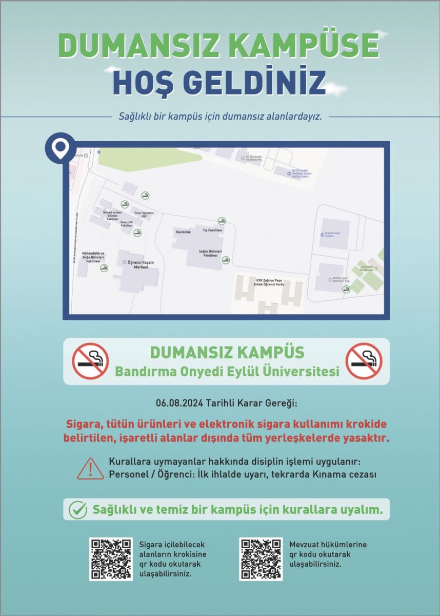 1- Bandırma Onyedi Eylül Üniversitesi’nin açık ve kapalı tüm alanlarında sigara ve diğer tütün ürünleri ile elektronik sigaraların kullanılması yasaktır.