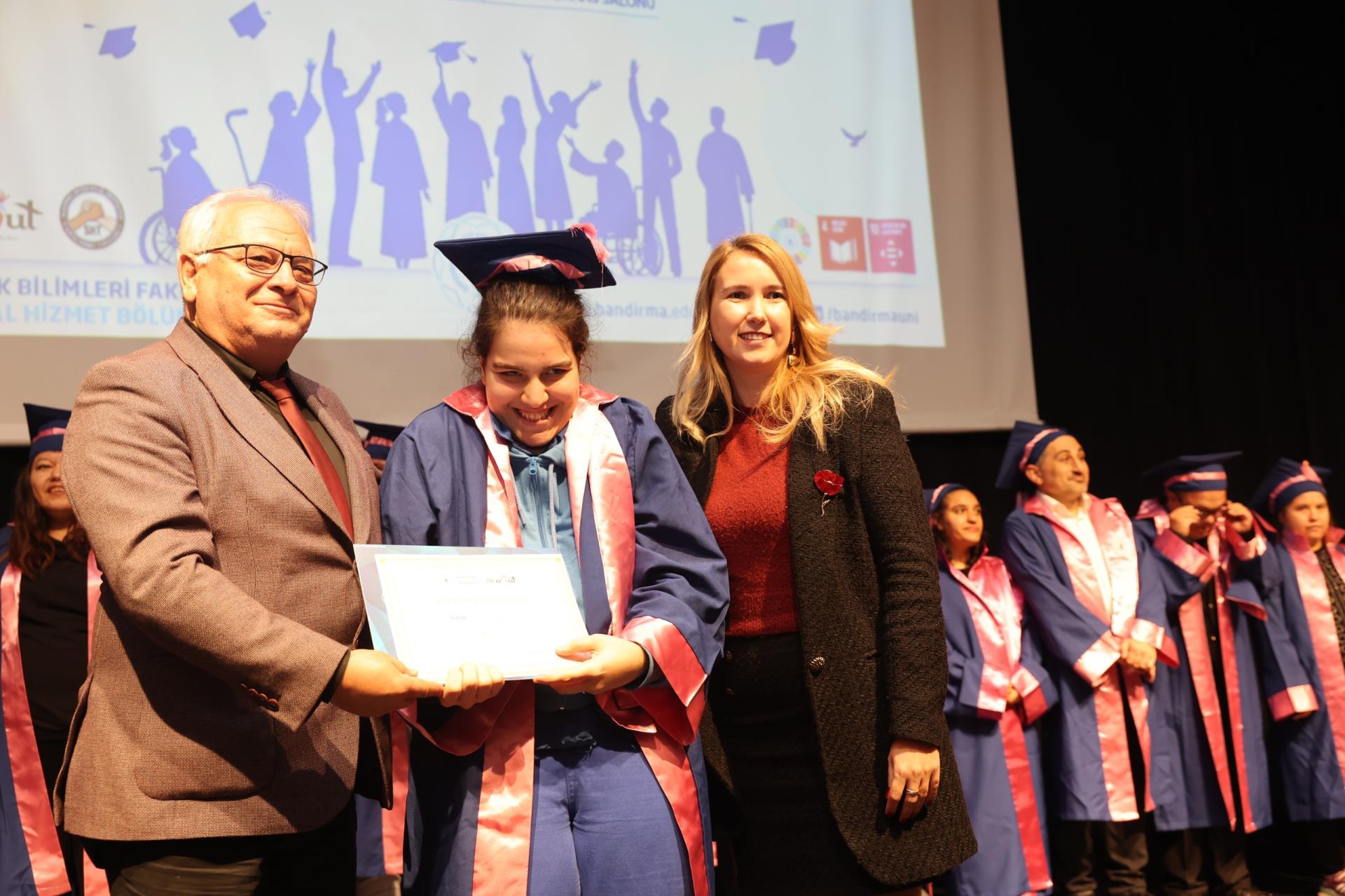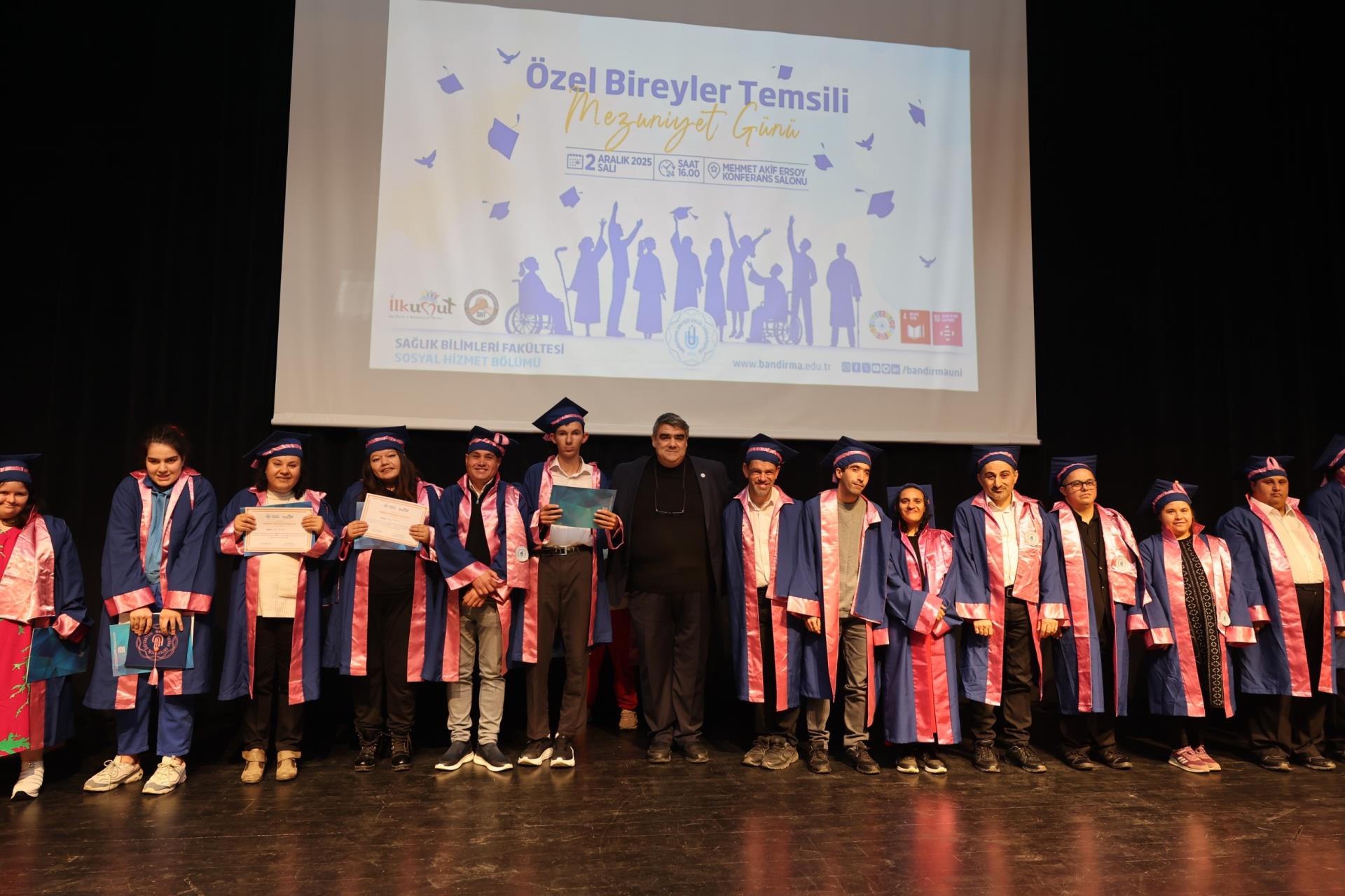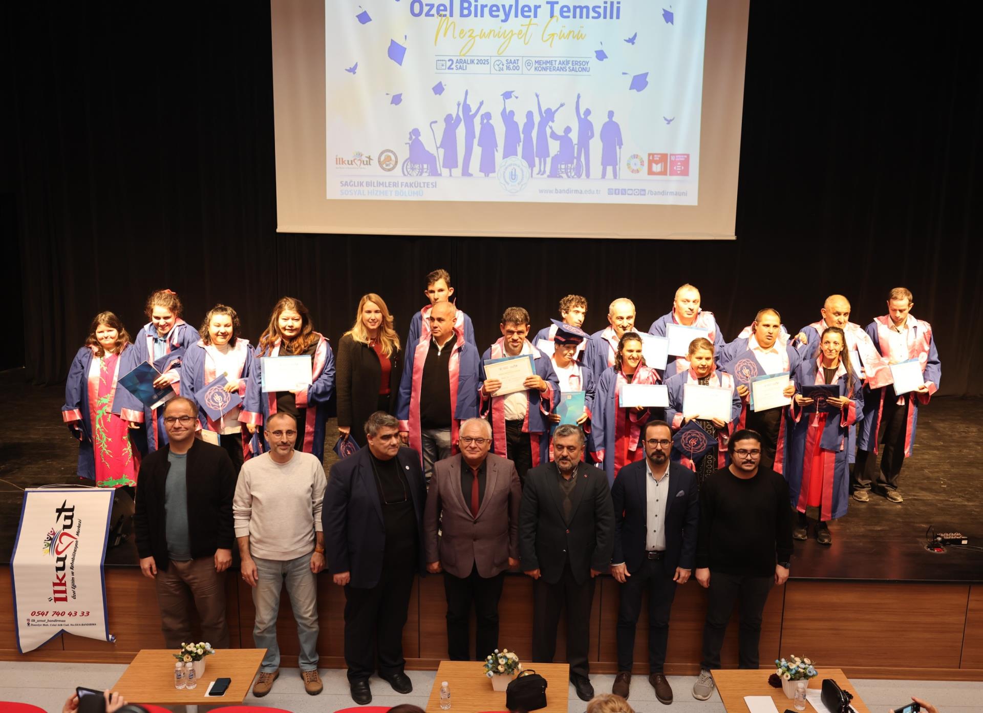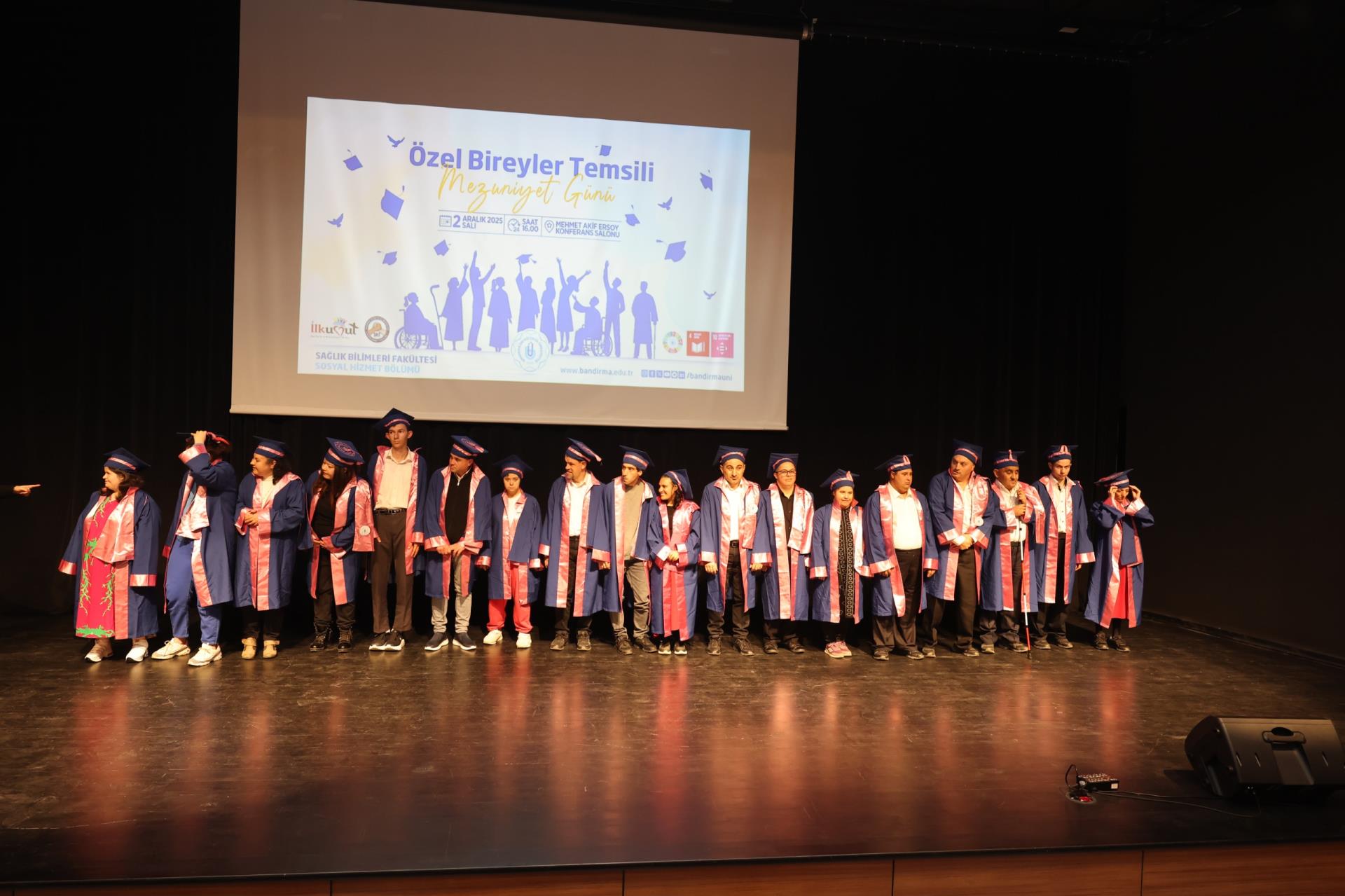 Bandırma Onyedi Eylül Üniversitesi Sağlık Bilimleri Fakültesi Sosyal Hizmet Bölümü, Sosyal Hizmet Topluluğu ve Bandırma İlk Umut Özel Eğitim ve Rehabilitasyon Merkezi iş birliğiyle Özel 3 Aralık Dünya Engelliler Günü dolayısıyla üniversitemizde “Temsili Mezuniyet Töreni” düzenledi. Saygı duruşu ve İstiklâl Marşı ile başlayan program açılış konuşmaları ile devam etti.