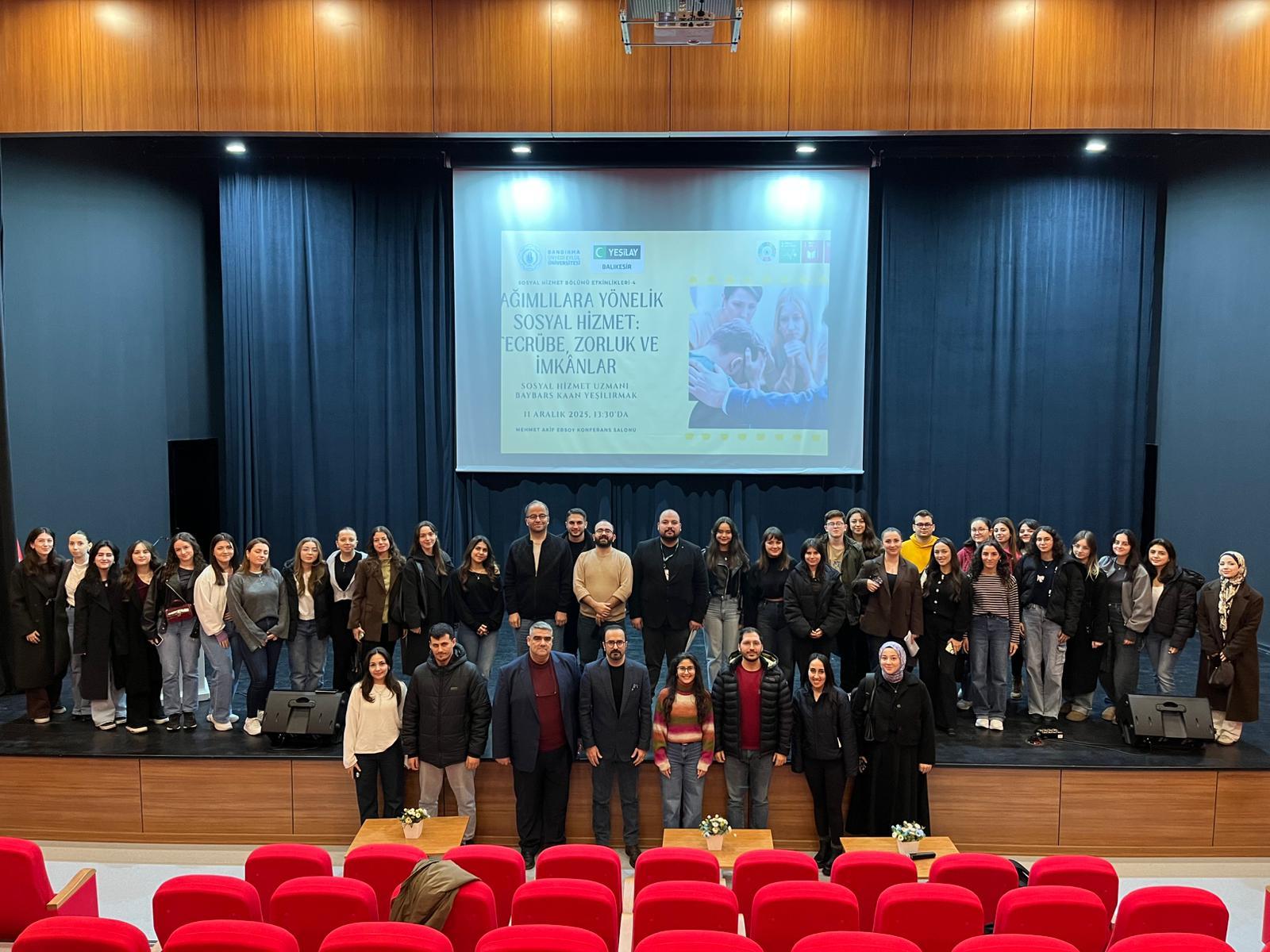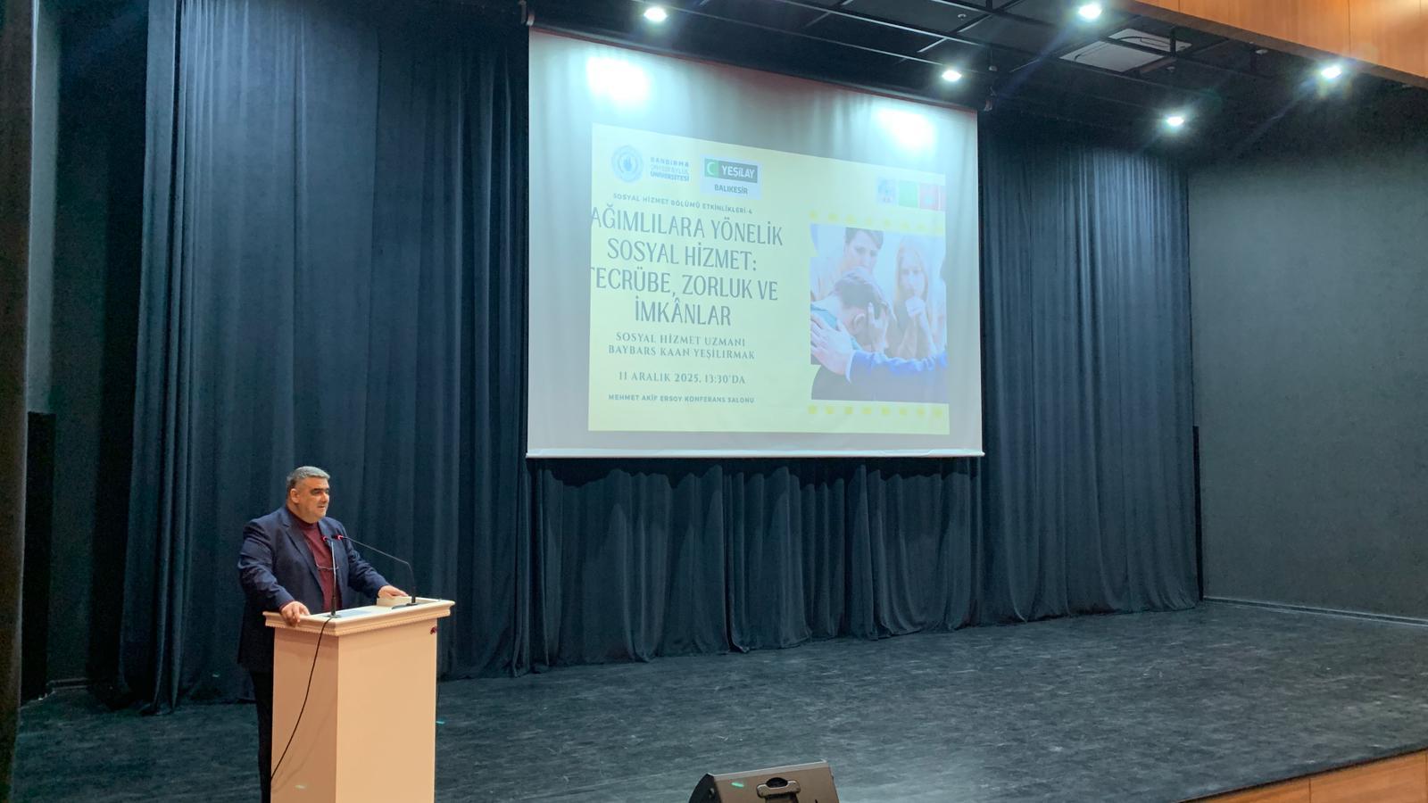 “Sosyal Hizmet Bölümü Etkinlikleri” kapsamında, üniversitemiz öğrenci ve personeli ile kamuya açık olarak “Bağımlılara Yönelik Sosyal Hizmet: Tecrübe, Zorluk ve İmkânlar” başlıklı bir program düzenlendi. Mehmet Akif Ersoy Konferans Salonu’nda gerçekleşen etkinliğin konuşmacısı, Balıkesir Yeşilay Danışmanlık Merkezi’nde Sosyal Hizmet Uzmanı olarak görev yapan Baybars Kaan Yeşilırmak oldu.